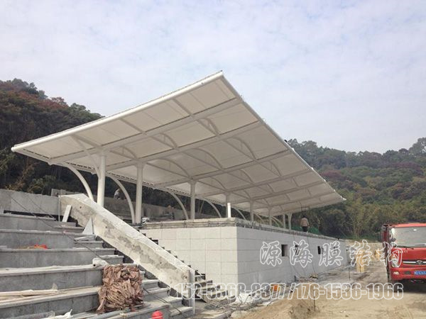 膜结构主要用于体育设施,在学校操场的体育看台或领奖台的屋顶。膜结构屋顶在大型体育场馆中也并不少见。一般的立柱形态由贝壳状的峰膜和端部张力膜组成,新颖活泼。钢架、索、膜巧妙组合,由膜、膜边索、脊索、谷索、索、杆及一定格梁稳定。膜的顶部过渡流畅,结构美观、轻巧,整体造型相互辉映,独树一帜。