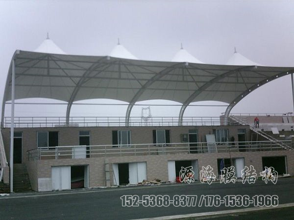 膜结构主要用于体育设施,在学校操场的体育看台或领奖台的屋顶。膜结构屋顶在大型体育场馆中也并不少见。一般的立柱形态由贝壳状的峰膜和端部张力膜组成,新颖活泼。钢架、索、膜巧妙组合,由膜、膜边索、脊索、谷索、索、杆及一定格梁稳定。膜的顶部过渡流畅,结构美观、轻巧,整体造型相互辉映,独树一帜。