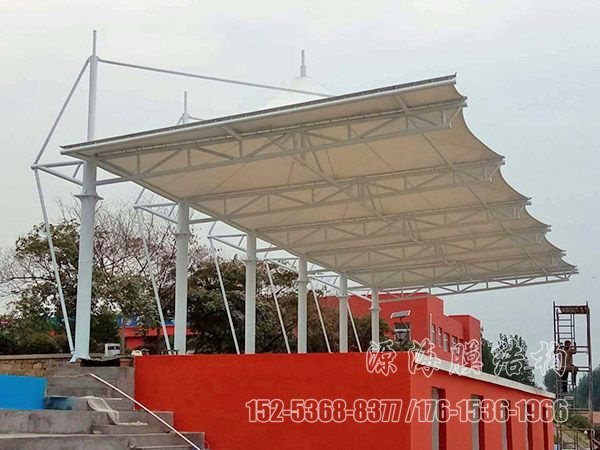 膜结构主要用于体育设施,在学校操场的体育看台或领奖台的屋顶。膜结构屋顶在大型体育场馆中也并不少见。一般的立柱形态由贝壳状的峰膜和端部张力膜组成,新颖活泼。钢架、索、膜巧妙组合,由膜、膜边索、脊索、谷索、索、杆及一定格梁稳定。膜的顶部过渡流畅,结构美观、轻巧,整体造型相互辉映,独树一帜。