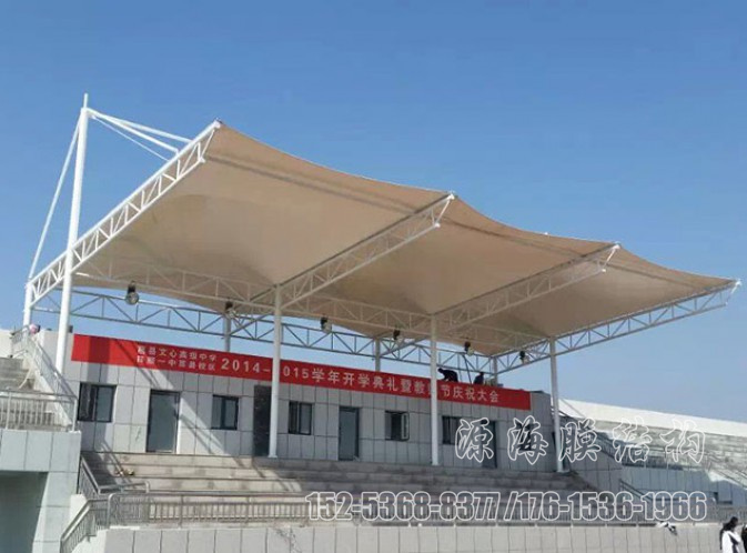膜结构主要用于体育设施,在学校操场的体育看台或领奖台的屋顶。膜结构屋顶在大型体育场馆中也并不少见。一般的立柱形态由贝壳状的峰膜和端部张力膜组成,新颖活泼。钢架、索、膜巧妙组合,由膜、膜边索、脊索、谷索、索、杆及一定格梁稳定。膜的顶部过渡流畅,结构美观、轻巧,整体造型相互辉映,独树一帜。