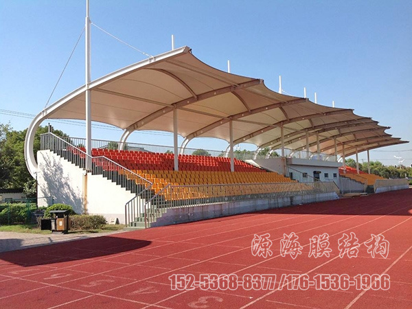 膜结构主要用于体育设施,在学校操场的体育看台或领奖台的屋顶。膜结构屋顶在大型体育场馆中也并不少见。一般的立柱形态由贝壳状的峰膜和端部张力膜组成,新颖活泼。钢架、索、膜巧妙组合,由膜、膜边索、脊索、谷索、索、杆及一定格梁稳定。膜的顶部过渡流畅,结构美观、轻巧,整体造型相互辉映,独树一帜。