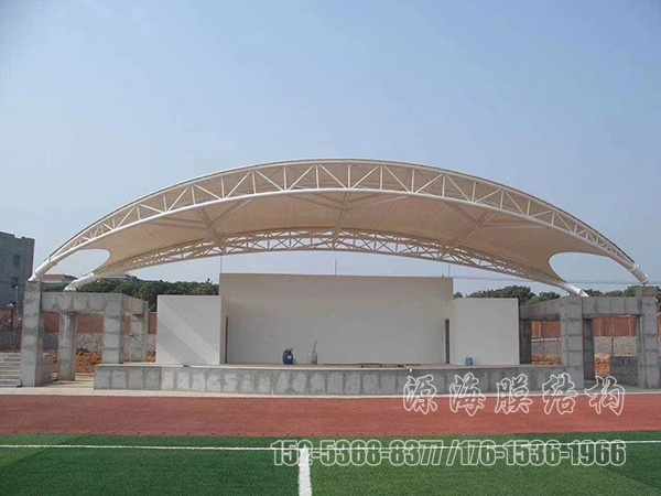 膜结构主要用于体育设施,在学校操场的体育看台或领奖台的屋顶。膜结构屋顶在大型体育场馆中也并不少见。一般的立柱形态由贝壳状的峰膜和端部张力膜组成,新颖活泼。钢架、索、膜巧妙组合,由膜、膜边索、脊索、谷索、索、杆及一定格梁稳定。膜的顶部过渡流畅,结构美观、轻巧,整体造型相互辉映,独树一帜。