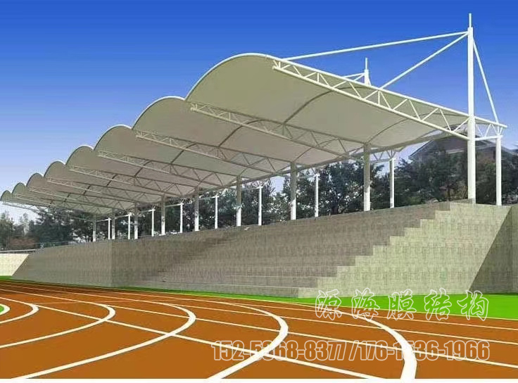 膜结构主要用于体育设施,在学校操场的体育看台或领奖台的屋顶。膜结构屋顶在大型体育场馆中也并不少见。一般的立柱形态由贝壳状的峰膜和端部张力膜组成,新颖活泼。钢架、索、膜巧妙组合,由膜、膜边索、脊索、谷索、索、杆及一定格梁稳定。膜的顶部过渡流畅,结构美观、轻巧,整体造型相互辉映,独树一帜。