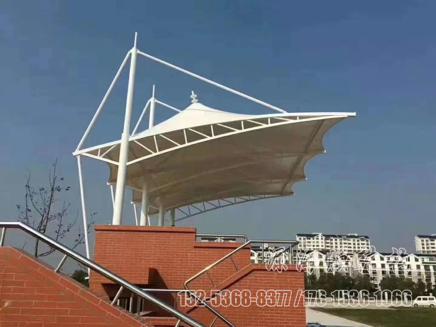 膜结构主要用于体育设施,在学校操场的体育看台或领奖台的屋顶。膜结构屋顶在大型体育场馆中也并不少见。一般的立柱形态由贝壳状的峰膜和端部张力膜组成,新颖活泼。钢架、索、膜巧妙组合,由膜、膜边索、脊索、谷索、索、杆及一定格梁稳定。膜的顶部过渡流畅,结构美观、轻巧,整体造型相互辉映,独树一帜。